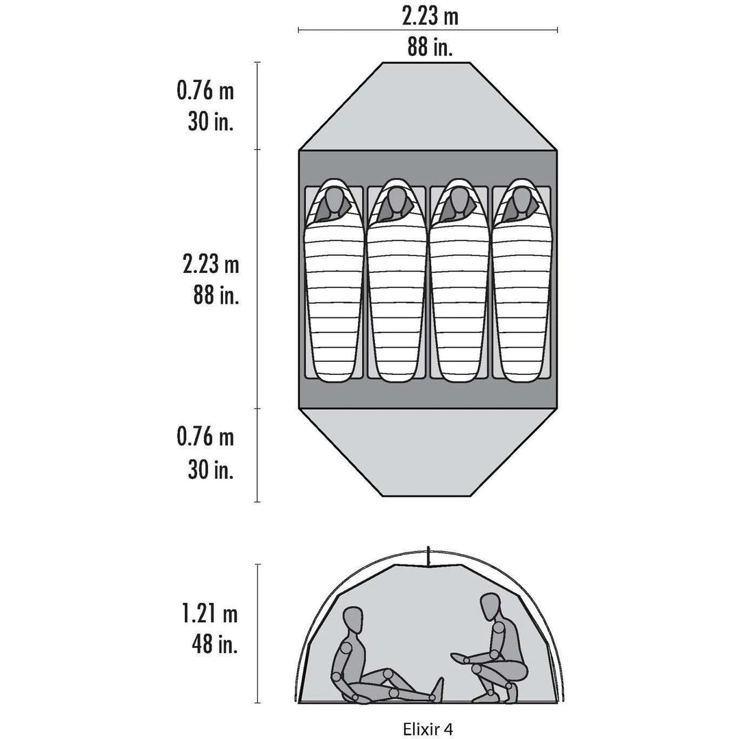In the latest version of the MSR Elixir, the 4-person tent the vestibules have a bit more room and a new color scheme. The perfectly balanced family tent! Great price, great design, and great quality! The MSR Elixir 4-person tent is a very well-priced tent that doesn’t sacrifice anything in liveability or durability. Room for 4 people with head and shoulder room. Two stay dry doors with vestibules that let you store gear in a storm worth fly. The canopy provides warmth and privacy as well as great ventilation!