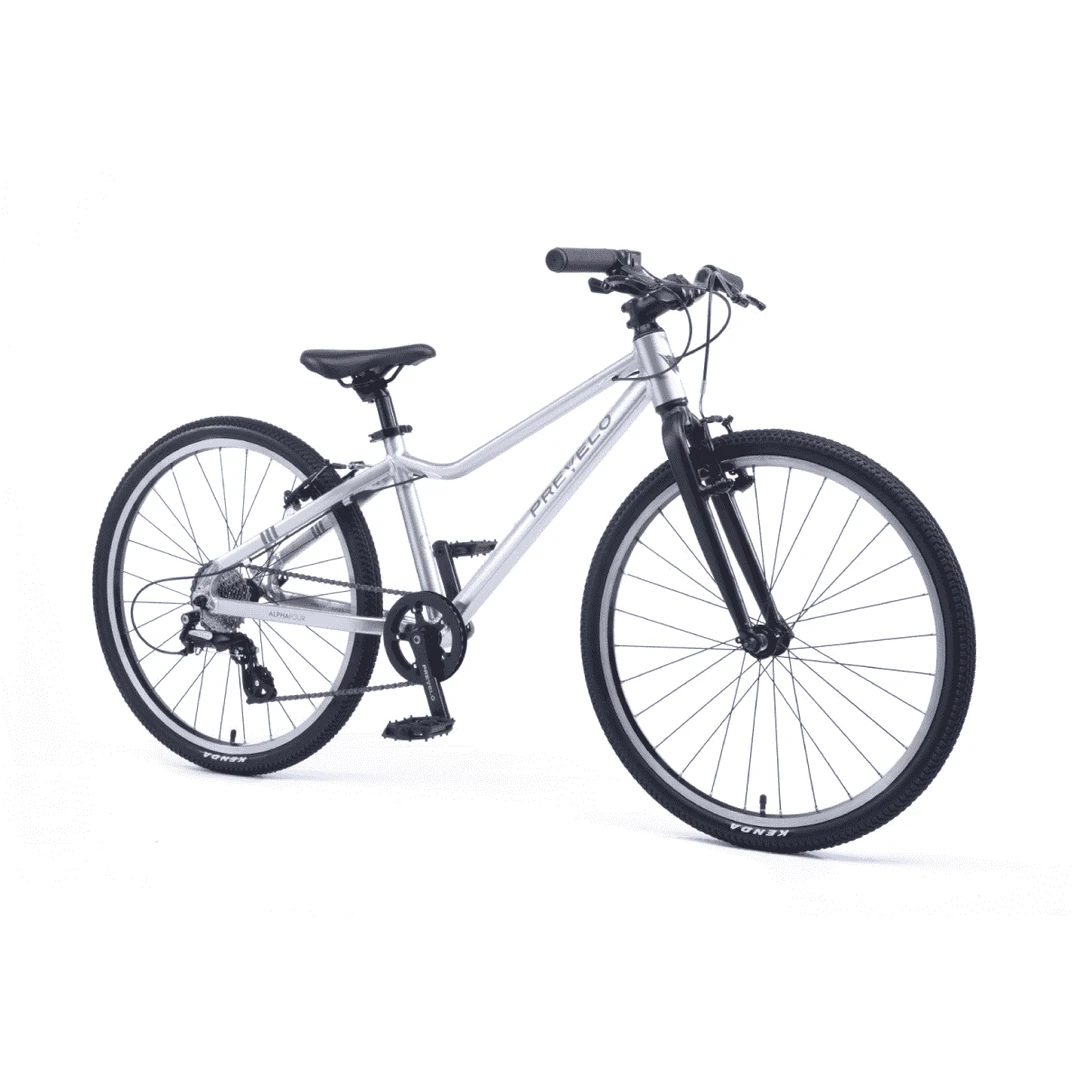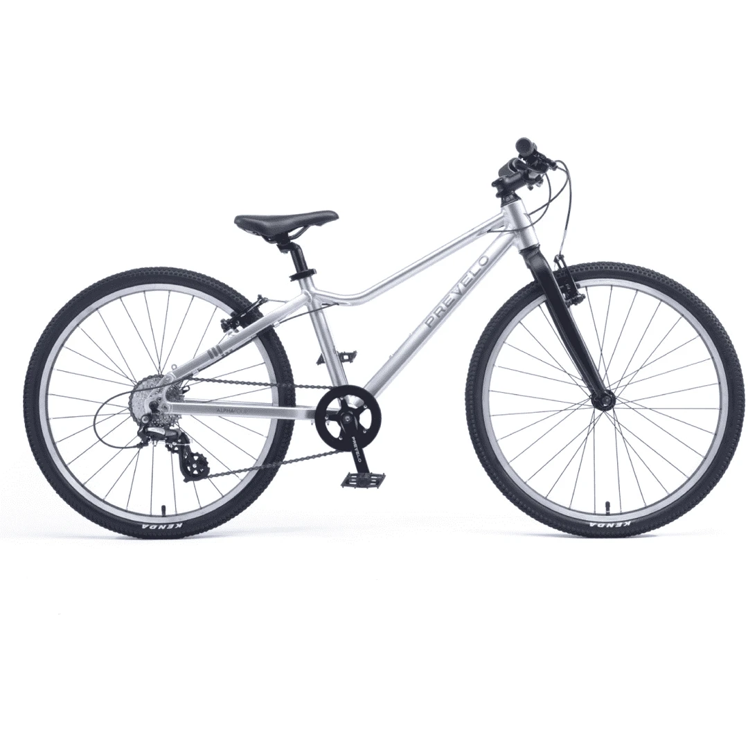 COMPONENT SPECIFICATION FRAME 6061 heat-treated aluminum alloy custom formed tubing FORK Aluminum alloy blades with Chromoly steerer tube – 35mm rake SEAT CLAMP Aluminum alloy with tool-less adjustment FRONT BRAKE Tektro aluminum alloy V-brake REAR BRAKE Tektro aluminum alloy V-brake FRONT BRAKE LEVER Tektro aluminum alloy REAR DERAILLEUR 8-speed Shimano Altus double servo with Smart cage SHIFTER REAR Shimano Acera RAPIDFIRE Plus FREEWHEEL/CASSETTE Shimano 11-34T CRANKSET Prevelo anodized alloy 3-piece square taper with 130MM crank length. SPROCKET 32T with double chainring guard BB SET Sealed cartridge HEADSET 1 1/8″ threadless RIM Aluminum with ground sidewalls FRONT HUB Lightweight alloy 1-piece forged CNC with quick release REAR HUB Lightweight alloy 1-piece forged CNC with quick release TIRE & TUBE Kenda Small Block Eight Pro 24 ×1.5 SADDLE Prevelo big kid saddle HANDLEBAR Prevelo aluminum big bore – 580mm width x 40mm rise with 31.8mm to 22mm taper HANDLEBAR STEM Aluminum 60mm extension GRIP Kraton rubber PEDAL Composite with 9/16 Chromoly axle