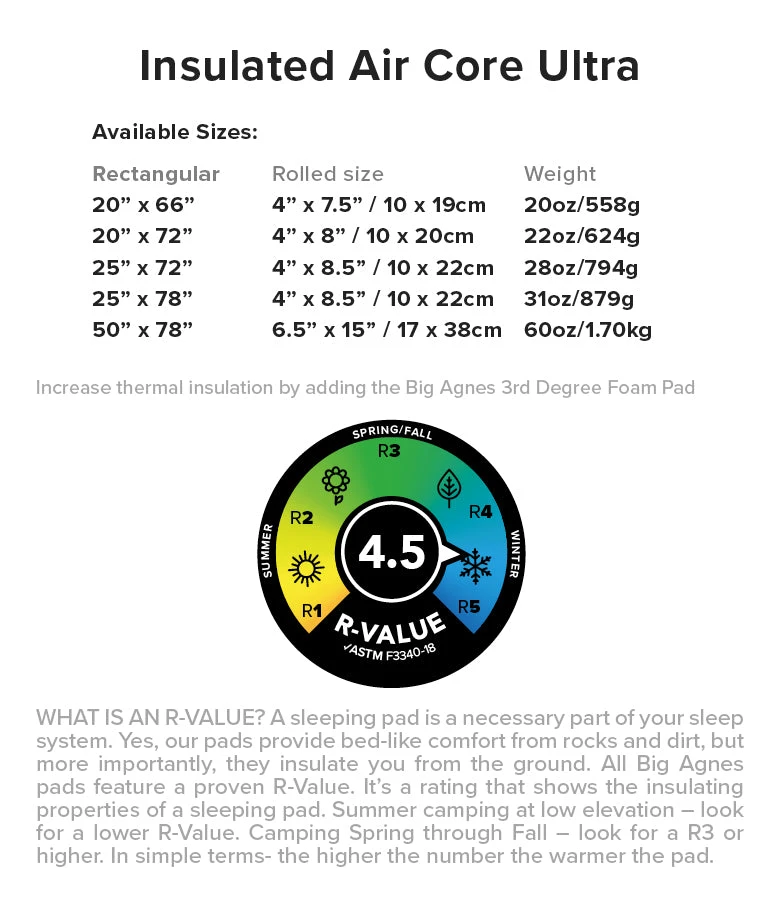 The Big Agnes Insulated Air Core Ultra Double Sleeping Pad takes the comfort to the next level but still rolls down to a manageable size. THERMOLITE® Insulation working with a heat reflective film traps body heat and reflects it back at you to prevent heat loss and aviation-grade TPU lamination technology for weld strength and ultimate dependability.