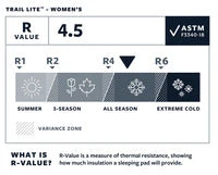 The Thermarest Trail Lite Trooper Women’s Regular sleeping pad is a great combination of value, comfort and packability.The die-cut premium foam is light and packable while still delivering critical warmth at camp. The 1.5-inch (3.8 cm) pad boasts a 4.5 R-value for year-round comfort. The versatile self-inflating pad features the high-performance WingLock valve, which has three times the airflow rate of the classic valve thanks to a larger opening and one-way inflation.